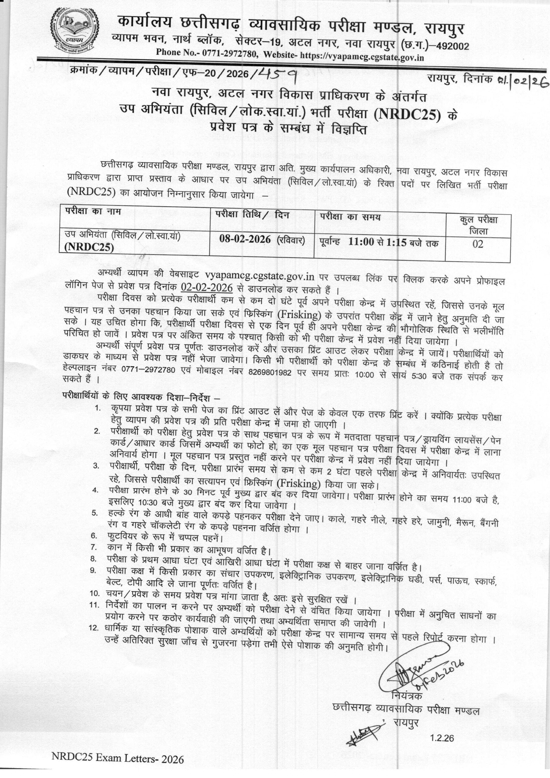 NRDC25 Admit card:- छत्तीसगढ़ व्यावसायिक परीक्षा मंडल (CG Vyapam) ने NRDC25 उप अभियंता (सिविल/लो.स्वा. यांत्रिकी) भर्ती परीक्षा के लिए एडमिट कार्ड (hall ticket) जारी कर दिए हैं CG Vyapam NRDC25 Admit Card 2026 OUT